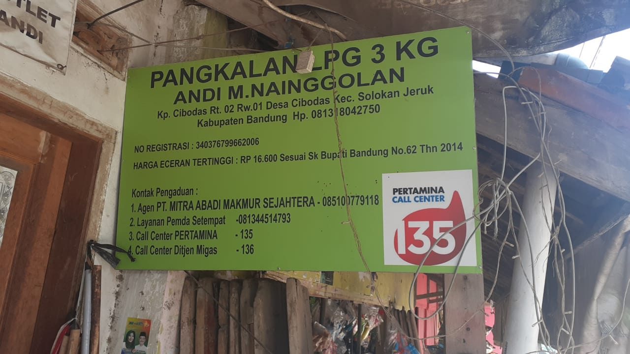 Salah satu pangkalan Tabung LPG 3 kilogram, Bapak Andi M . Nainggolan. tidak sesuai harga (Het) yang sudah terpangpang di papan publik Migas, yang sudah di terapkan peraturan presiden republik Indonesia ( NOMOR 104 TAHUN 2007 ) Tentang penyediaan, pendistribusian, dan penetapan harga Gas tabung 3 kilogram ( Liquefied petroleum ) yang berdomisili di daerah kp. Cibodas Rt 03 Rw 01 Desa Cibodas kecamatan Solokan jeruk kabupaten Bandung.
