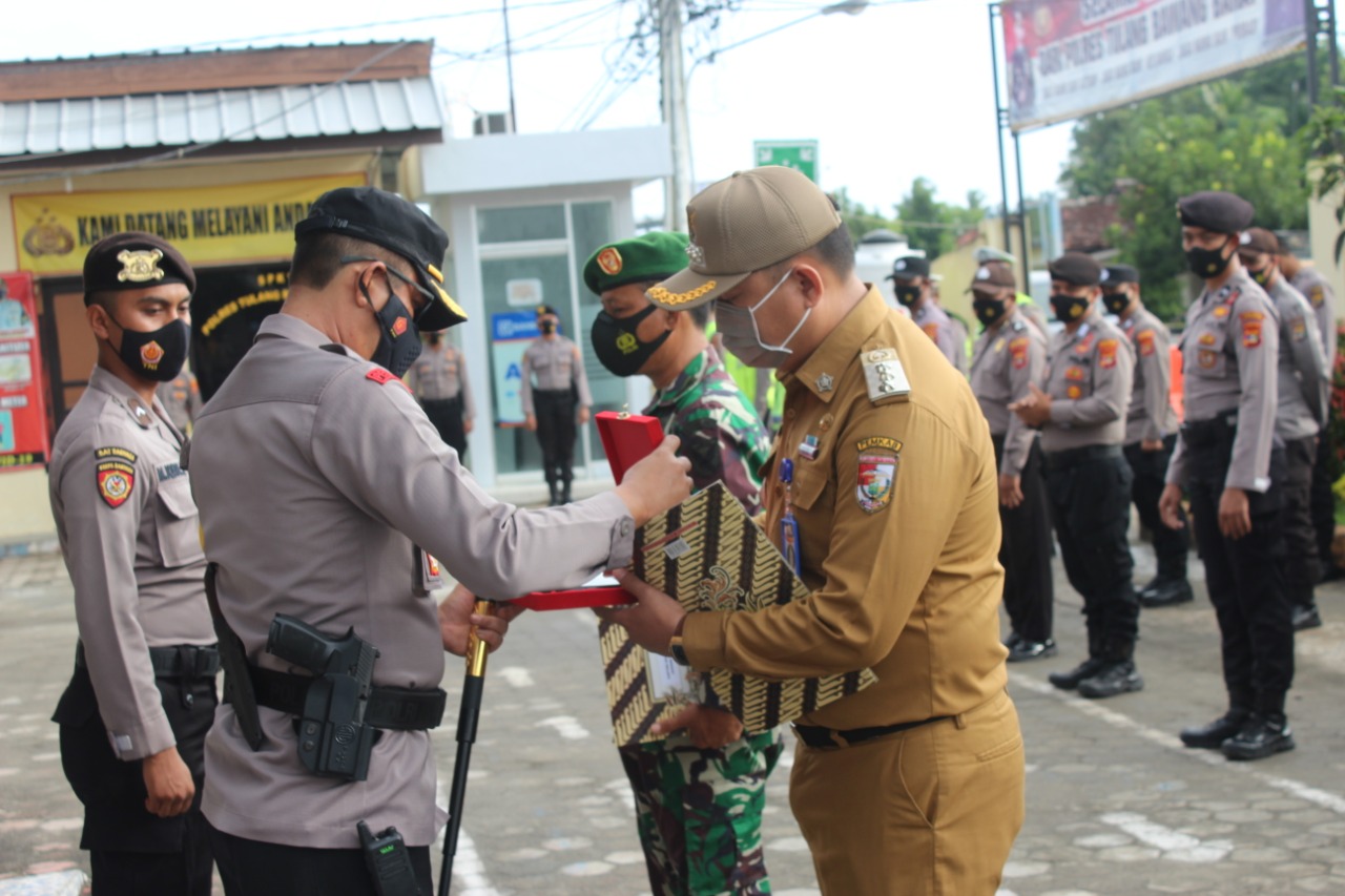 Kapolres Tulang Bawang Barat AKBP Hadi Saepul Rahman S.IK memberikan penghargaan kepada Camat TBT Achmad Nazaruddin, S.IP ., M.IP dan Danramil 412-01/TBT Kapten INF Jauhari Dalam rangka keaktifan penerapan protokol kesehatan dan menciptakan kamtibmas yang kondusif Beserta Anggota Polres Tulang Bawang Barat yang melaksanakan Pemulasaran Jenazah Covid 19 Pada saat Apel Pagi di Mako Polres Tulang Bawang Barat,Senin (8/2/2021 ).