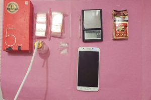 Saat penggerebekan dilakukan, polisi menemukan barang bukti sabu seberat 0,77 gram dalam dua klip plastik dari genggaman tersangka dan barang bukti lainnya berupa 1(satu) timbangan elektrik, 1(satu) alat hisap atau bong, 1(satu) pipet kaca dan skrop dari sedotan, 1(satu) buah alat komunikasi