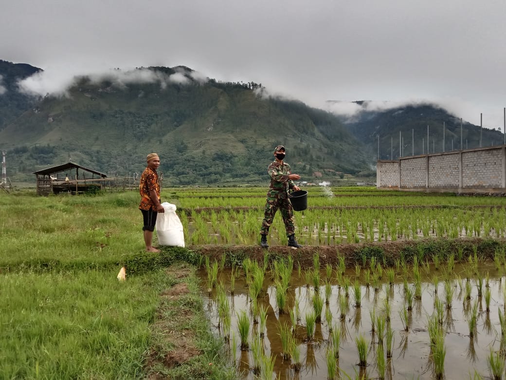 Takengon- Babinsa 01/Bintang Kodim 0106/Ateng Serda Amris melaksanakan pendampingan pemupukan tanaman padi milik yusuf ,di desa kala kec, bintang kab, Aceh tengah.