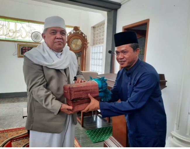 Bupati Bandung terpilih HM Dadang Supriatna menyerahkan cindera mata kepada Pimpinan Ponpes Darul Ma’arif KH Sofyan Yahya, di Desa Rahayu, Kec Margaasih, Kab Bandung, Jumat (12/2)