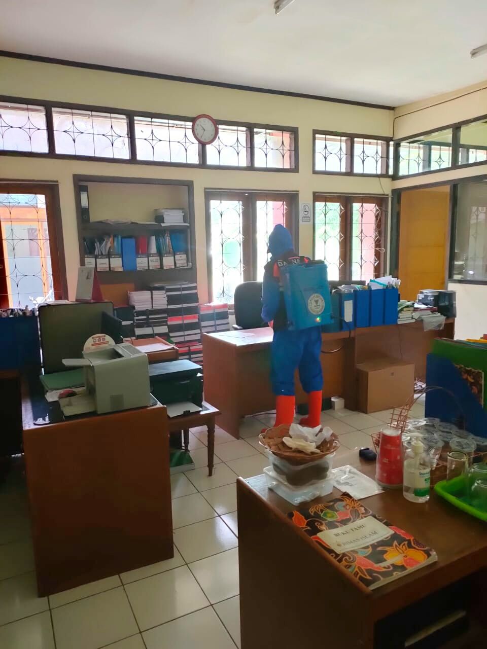 “Tim semprot dengan sprayer gendong yang menyemprot seluruh ruangan Kemenag Kabupaten Bandung agar mematikan virus Covid-19,” ujarnya