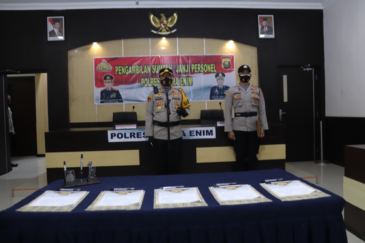 Setelah vicon (video conference) tersebut selanjutnya Kapolres Muara Enim AKBP Danny Sianipar S.I.K memimpin upacara Pengambilan sumpah / janji personil Polres Muara Enim tersebut di aula Rupatama Polres Muara Enim,