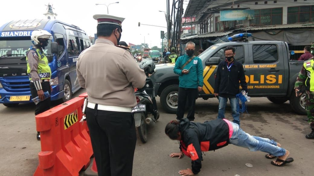 Petugas Polsek Rancaekek Polresta Bandung memberikan sanski fisik berupa Push up kepada warga yang melanggar Protokol Kesehatan (Protkes) di Dangdeur, Kecamatan Rancaekek, Kabupaten Bandung. Satgas Covid-19 Kecamatan Rancaekek yang terdiri atas unsur TNI, Polri, dan Satuan Polisi Pamong Praja Kecamatan Rancaekek menggelar Operasi Yustisi Protokol Kesehatan pada Jum’at 19 Februari 2021.