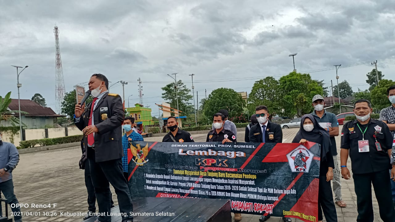 Lembaga Komunitas Pengawas Korupsi (LKPK) Provinsi Sumatera Selatan (Sumsel) bersama dengan masyarakat melakukan aksi damai didepan kantor Bupati guna untuk menagih janji Pemerintah untuk memperbaiki jaringan Saluran Persediaan Air Minum (SPAM) yang berada di Desa Tanjung Baru Kecamatan Pendopo.