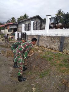 Babinsa bersama warga bahu membahu menimbun jalan yang rusak agar warga dapat beraktivitas kembali dan perbaikan jalan difokuskan melakukan penimbunan pada jalan yang berlubang menggunakan pasir batu bekas bangunan dengan harapan tidak muncul jalan berlubang yang baru.