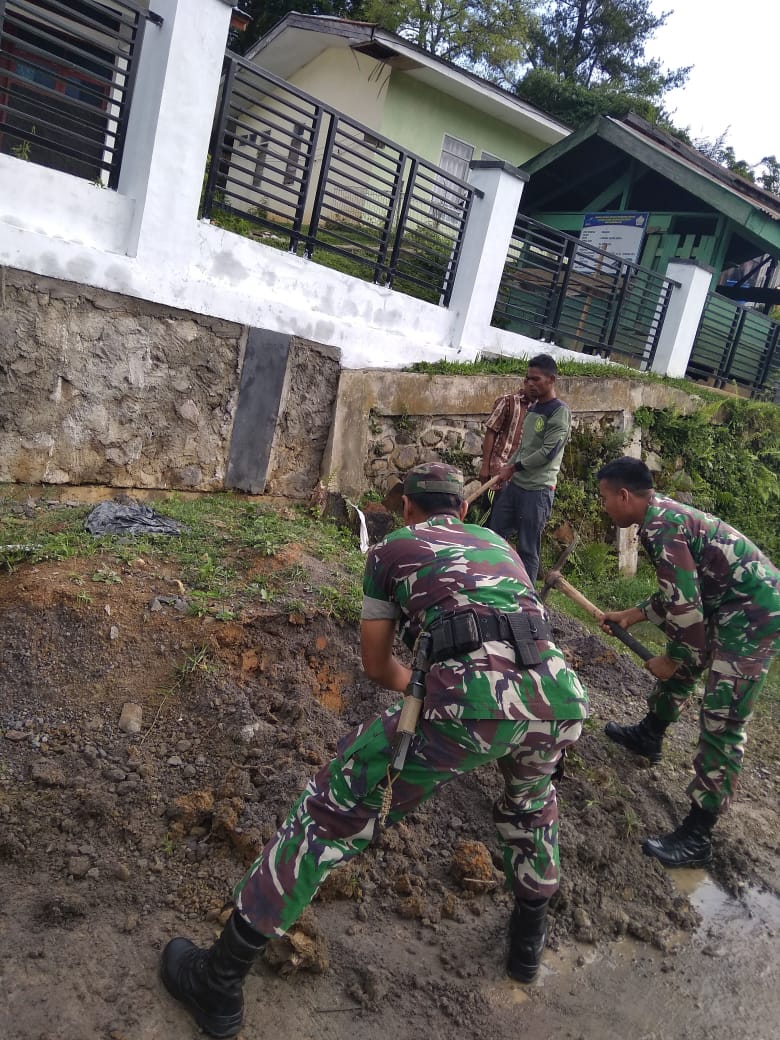 Babinsa bersama warga bahu membahu menimbun jalan yang rusak agar warga dapat beraktivitas kembali dan perbaikan jalan difokuskan melakukan penimbunan pada jalan yang berlubang menggunakan pasir batu bekas bangunan dengan harapan tidak muncul jalan berlubang yang baru.