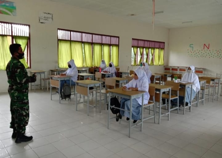 Kalibernews.net.Nagan Ra  ya,’Babinsa Posramil Kualka Pesisir Kodim 0116/Nagan Raya Serda Kamarudin melaksanakan anjangsana ke SMA Negeri 3 Kuala dengan memberikan materi wawasan kebangsaan yang ada di wilayah binaannya di Desa Padang Panjang Kecamatan Kuala Pesisir Kabupaten Nagan Raya, Kamis (12/08/21).
