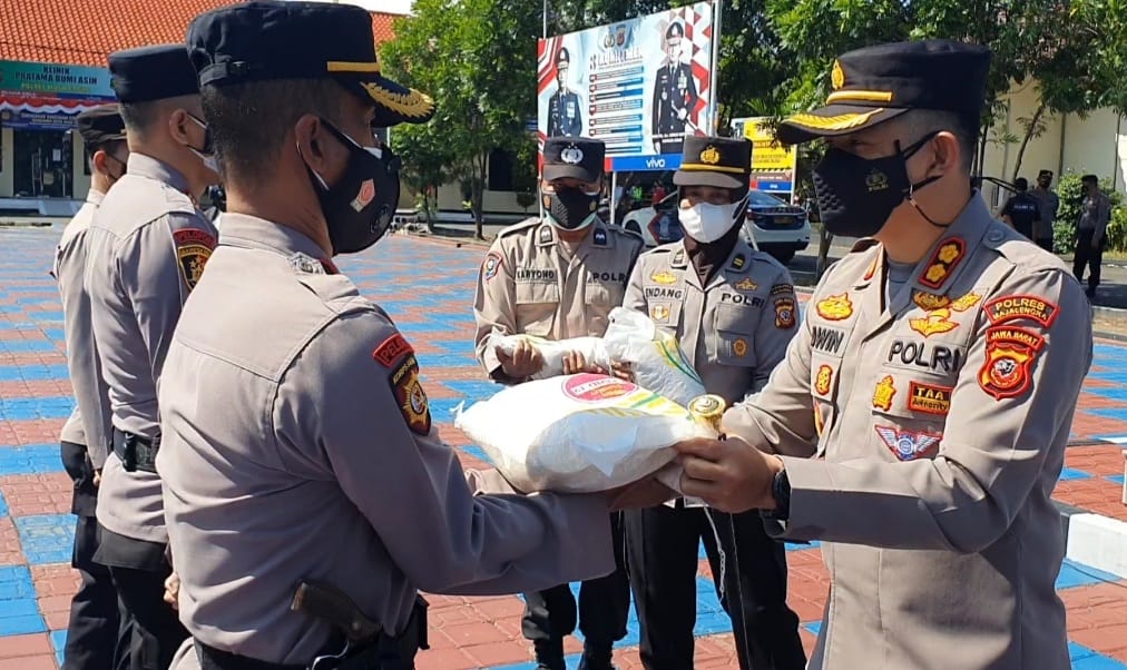 Penyerahan Bansos berupa bersa dilakukan secara simbolis oleh Kapolres Majalengka kepada perwakilan Kapolsek di Lapangan Apel Polres Majalengka dan dilanjutkan dengan pelepasan rombongan serta Bhabinkamtibmas langsung memberikan beras bansos kepada masyarakat yang berhak menerima.