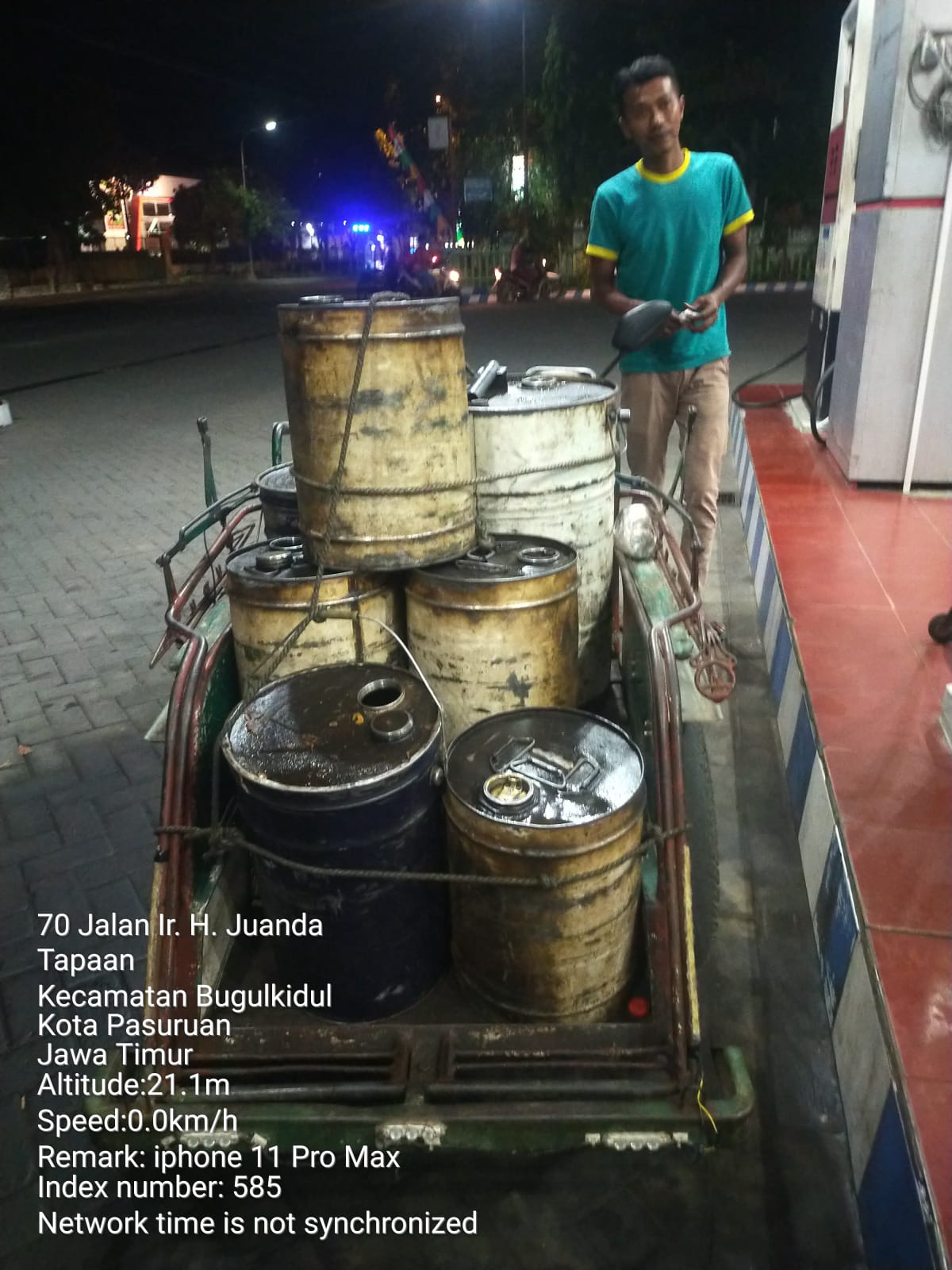 Petugas SPBU saat mengisi BBM jenis solar yang bersubsidi melainkan non subsidi yang di angkut mengunankan becak yang mengangkut sebanyak 7 drum yang berisi 50 liter / drum.
