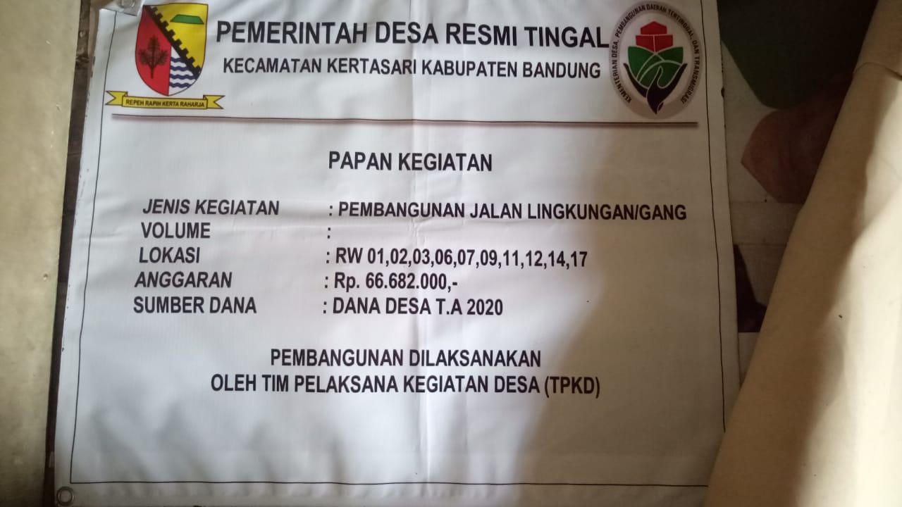 Dan yang paling saya serta warga masyarakat Desa Resmi Tinggal ingin pertanyakan dan ingin tahu regulasi uang/Anggaran tersebut,karena terkait pembagian AnggaranĀ tersebut, yang diterimanya hanya material berbentuk 10 Sak Semen 1 Engkel Pasir Pasang, jika dihitung/Estimasi secara matematika barang/material ituĀ diperkirakan hanya sekitar Rp .1.700.000 setiap RW- nya, danĀ yang melaksanakan pekerjaannya pun itu dikerjakan oleh Warga masyarakat/swadaya murni masyarakat bukan Oleh TPKD Desa Resmitinggal
