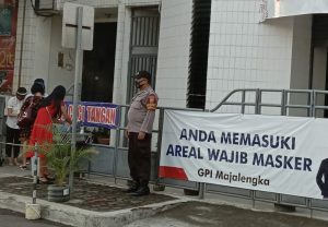 Disela Pengamanannya, kedua personel Polsek Makalengka Kota Polres Majalengka tersebut terlihat menyapa sejumlah jemaat guna menyampaikan sosialisasi tentang pendisiplinan penerapan protokol kesehatan kepada Jemaat Gereja Penyebaran Injil.