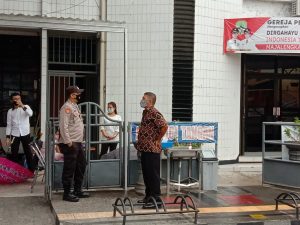 Kalibernew,-Majalengka,- Personil Polsek Majalengka Kota Polres Majalengka AIPTU Deni bersama anggota lainnya melaksanakan patroli dan pengamanan bertempat di Gereja Penyebaran Injil Jalan Ahmad Yani Kelurahan Majalengka Wetan Kecamatan dan Kabupaten Majalengka, Minggu (12/9/2021).