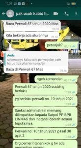“Baca Perwali No. 67 Tahun 2020. Sampean sebenarnya siapa. Kesini diakusi dengan saya,” ucap Bapak Ucok melalui pesan singkat WA.