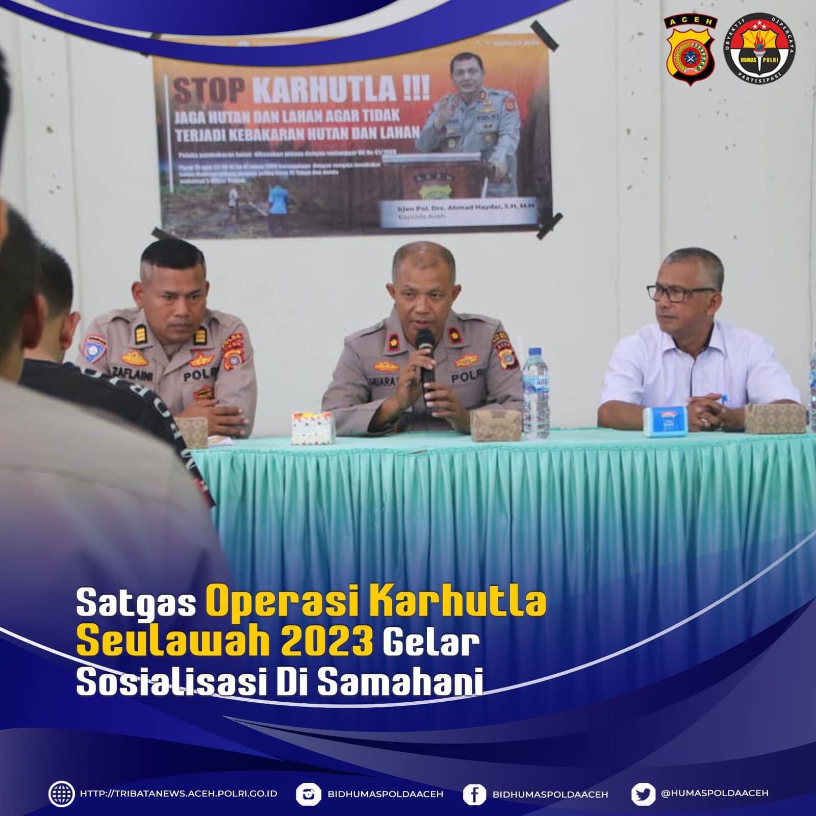 Sosialisasi yang digelar di Samahani hari ini oleh Satgas Operasi Karhutla Seulawah 2023, selain menyampaikan arahan dan edukasi kepada para Keuchik tentang Karhutla, juga menyerahkan Maklumat Kapolda Aceh tentang Karhutla agar ditempel di tempat strategis di desanya, kumudian Satgas Operasi berikutnya memasang spanduk ditempat strategis di daerah itu.