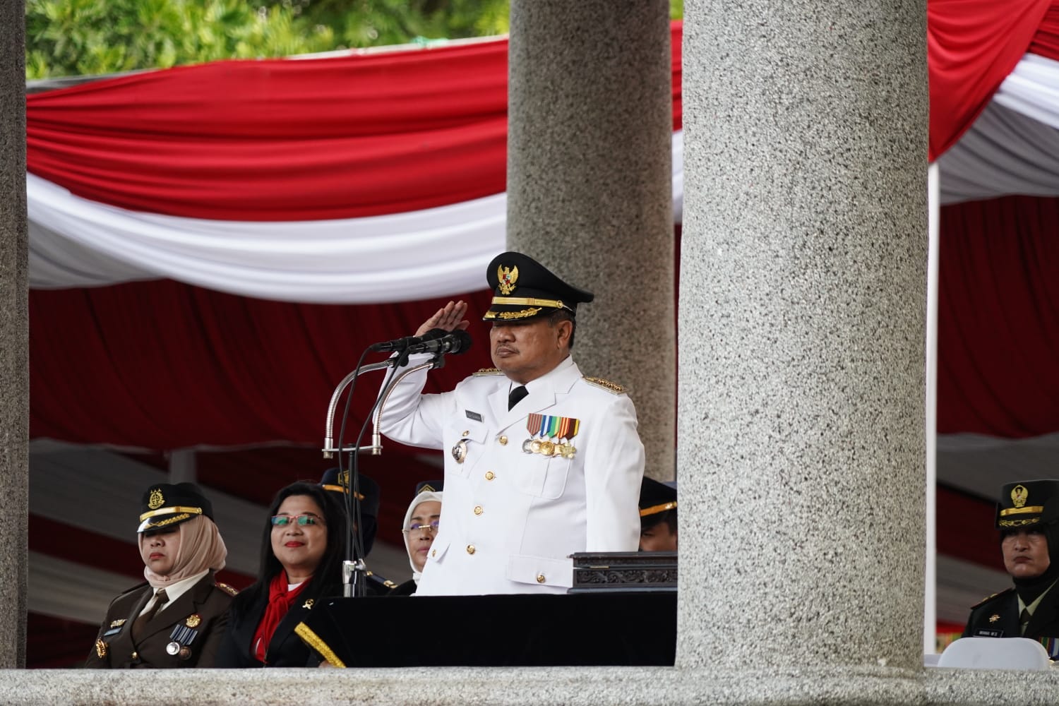 Bertindak selaku Inspektur Upacara, Bupati Garut, Rudy Gunawan, berdiri gagah di sebuah bangunan ikonik khas Kabupaten Garut yaitu Babancong.