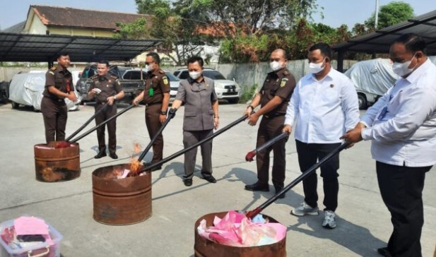 pemusnahan dengan cara dibakar, dipotong- potong, dan diblender dengan air kemudian dibuang sehingga tidak dapat digunakan lagi yang dilakukan di halaman kantor Kejaksaan Negeri Karawang, Rabu, (23/8).