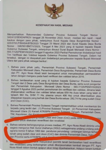“Bahwa selama berlangsungnya proses mediasi,PT.Agro Nusa Abadi(ANA) diminta untuk segera mengurus Hak Guna Usahanya(HGU) sebagaimana undang-undang pokok agraria nomor 5 tahun 1960 dan peraturan perundang-undangan lainnya..