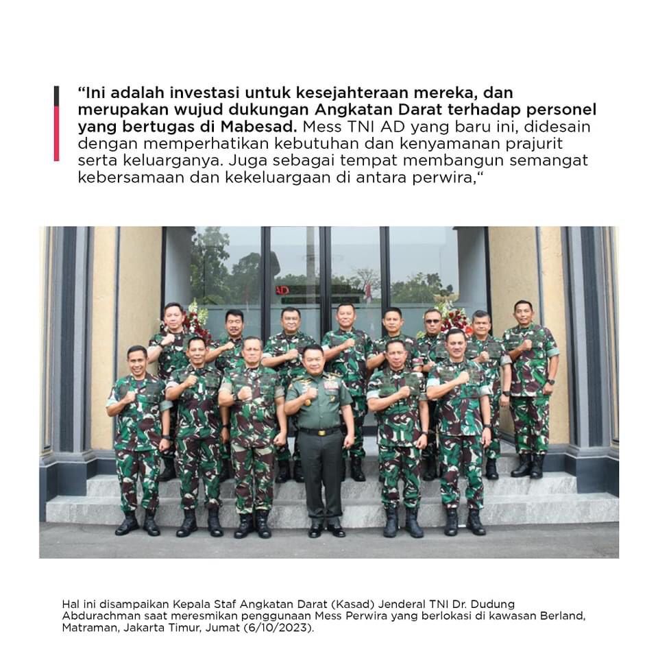 – Dalam rangka menyediakan fasilitas hunian yang layak dan nyaman bagi Perwira yang berdinas di lingkungan Markas Besar Angkatan Darat (Mabesad) beserta keluarganya, Kepala Staf Angkatan Darat (Kasad) Jenderal TNI Dr. Dudung Abdurachman, meresmikan penggunaan Mess Perwira yang berlokasi di kawasan Berland, Matraman, Jakarta Timur, Jumat (6/10/2023).