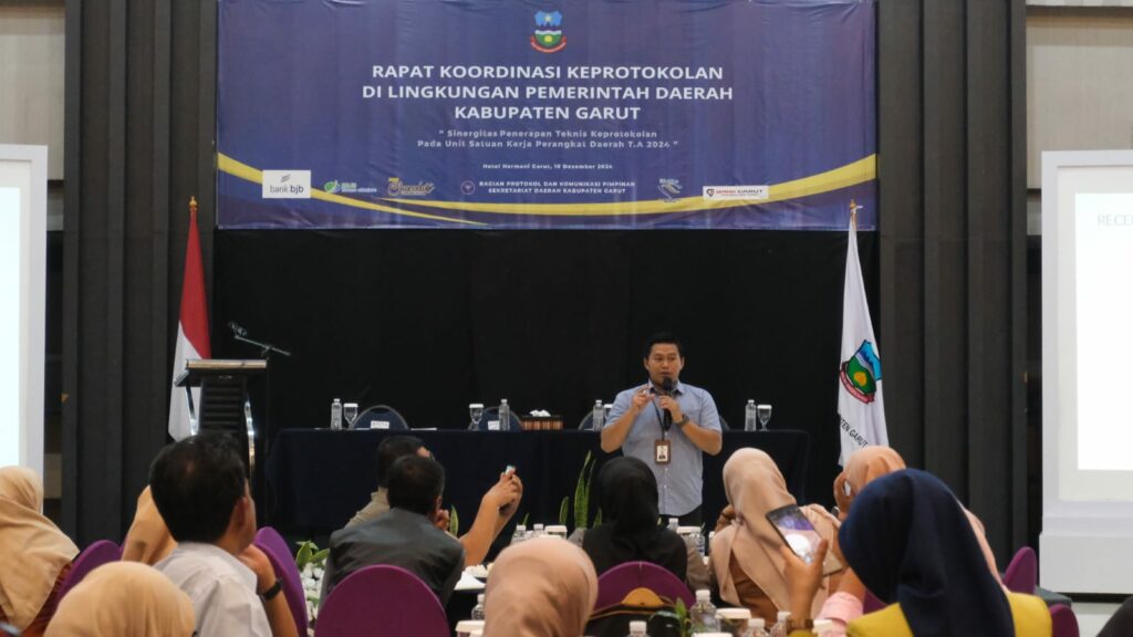 Rapat Koordinasi Keprotokolan di lingkungan Pemerintah Kabupaten Garut Tahun 2024 yang berlangsung di Ballroom Hotel Harmoni, Jalan Cipanas Baru, Kecamatan Tarogong Kaler, Kabupaten Garut, Selasa (10/12/2024).
