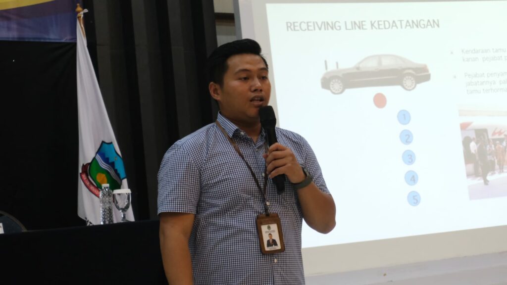 Kegiatan ini menghadirkan tiga narasumber, yaitu Analis Pelayanan Bagian Protokol Kementerian Dalam Negeri, Sampitmo Karina Boangmanalu; Analis Informasi Protokol Setda Provinsi Jawa Barat, Rizal Muttaqien Rusmawan; serta Professional Communication Consultant, Vivie Novidia.