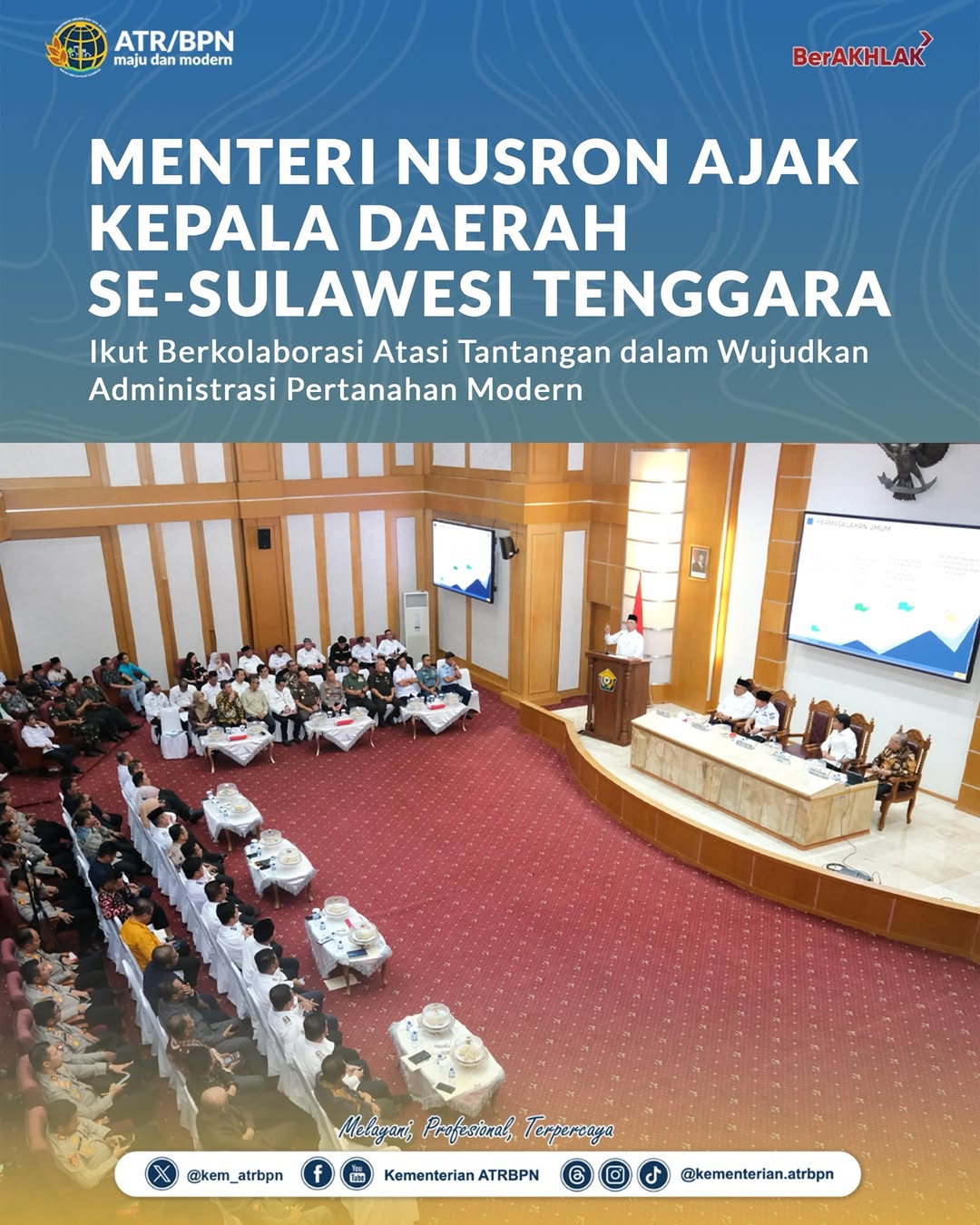 *Kendari – Kalibernews.-//- Menteri Agraria dan Tata Ruang/Kepala Badan Pertanahan Nasional (ATR/BPN), Nusron Wahid, pada Rabu (28/05/2025), mengajak kepala daerah di Sulawesi Tenggara untuk berkolaborasi mewujudkan sistem administrasi pertanahan yang modern dan inklusif. Sistem tersebut terdiri dari empat klaster utama, yaitu land tenure, land value, land use, serta land development.