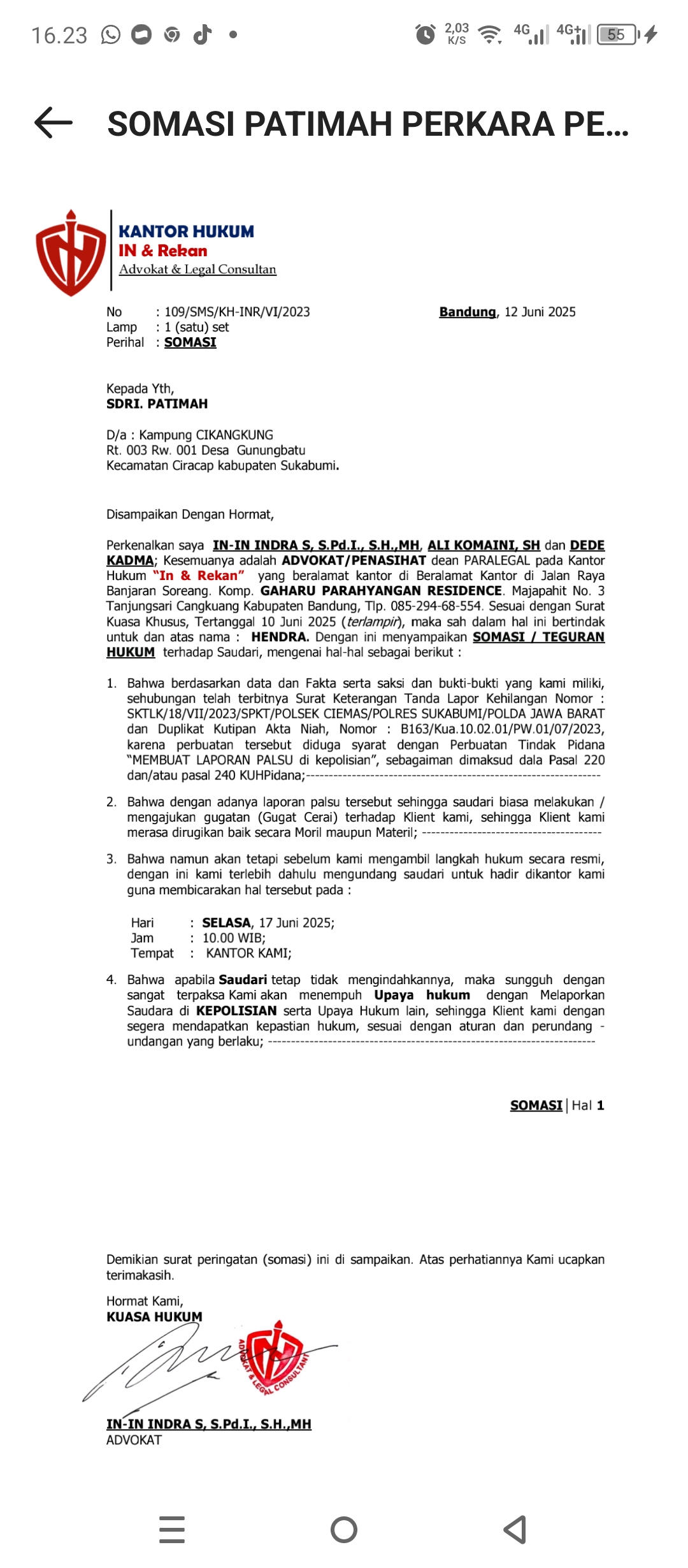 Sukabumi,-Kalibernews.net.-Kantor Hukum In. & Rekan yang berdomisili di Jl raya Banjaran Soreang Kp.Gaharu Parahyangan Residence Majapahit No 3 Tanjungsari Cangkuang Kabupaten Bandung, sebagai kuasa hukum Hendra Bin Hadsuloh 35 tahun telah Layangkan surat Somasi ke 1 kepada Sdri Patimah Binti Mulyani yang berdomisili di Kampung Cikangkung RT 03 01 Desa Gunung Batu Kecamatan Ciracap Kabupaten Sukabumi.Surat somasi dari kantor hukum In & Rekan memiliki register nomor: 109/SMS/KH-INR/VI/2025. Lampiran: 1 ( Satu ) Set. Perihal: Somasi dikeluarkan pada hari Kamis tanggal 12 Juni 2025 dicap dan ditandatangani oleh In In Indra.S.S.Pd.I.SH,.MH.