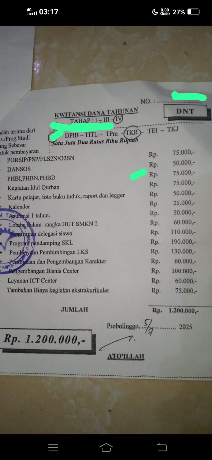 Rincian DNT tersebut meliputi berbagai kegiatan seperti lomba siswa, peringatan hari besar, asuransi, pengembangan ICT, bisnis center, hingga program ekstrakurikuler. Pungutan ini dinilai tidak transparan dan memberatkan wali murid, terutama kalangan ekonomi menengah ke bawah.