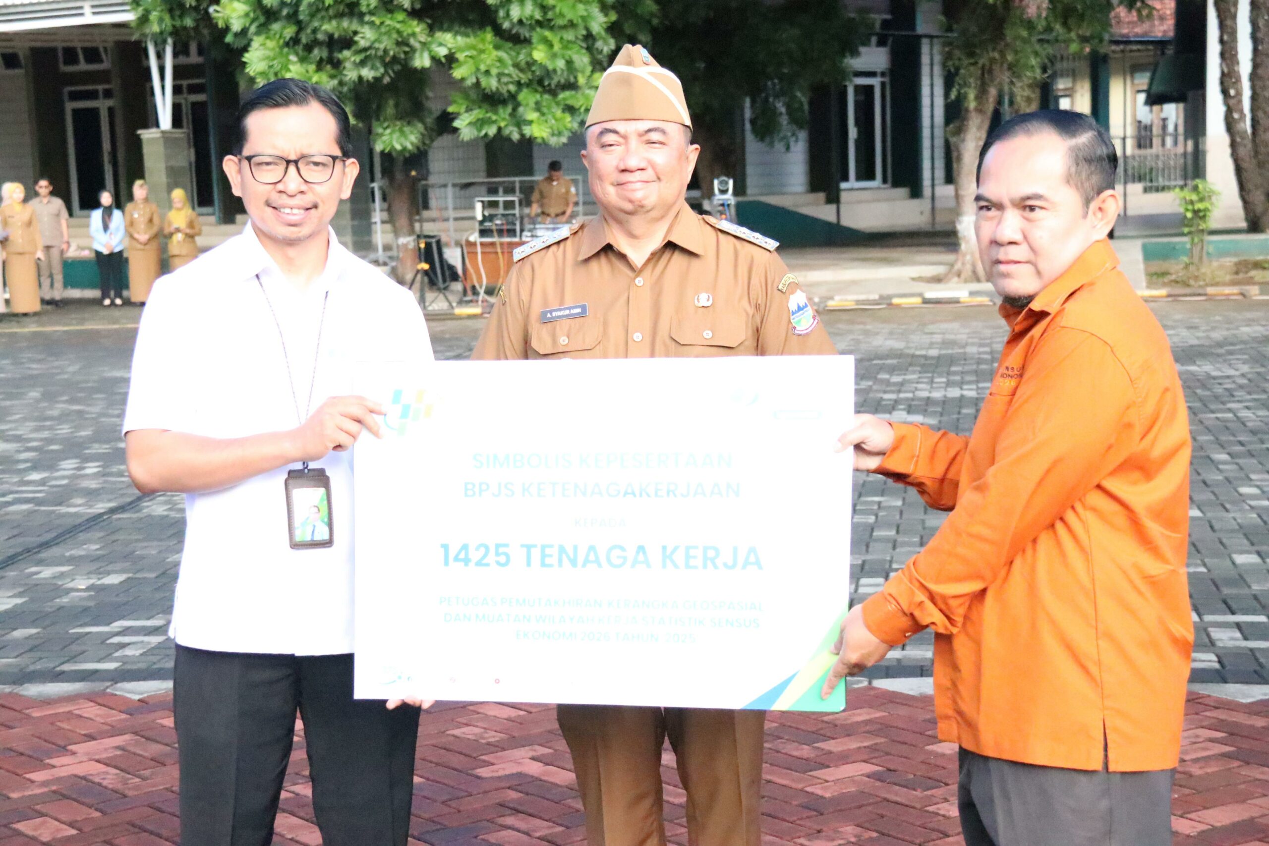GARUT,-Kalibernews.net.-//– Bupati Garut, Abdusy Syakur Amin, memimpin apel gabungan di Lapangan Sekretariat Daerah Kabupaten Garut pada Senin (4/8/2025). Dalam acara tersebut, Bupati secara simbolis menyerahkan kartu BPJS Ketenagakerjaan kepada petugas non-organik dan mitra statistik Badan Pusat Statistik (BPS) Kabupaten Garut, sebagai bagian dari dukungan pemerintah daerah untuk persiapan Sensus Ekonomi 2026.
