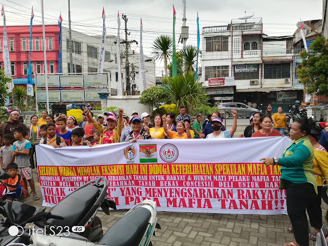 Massa aksi mendesak Presiden RI segera serahkan tanah untuk rakyat & hukum mati pelaku mafia tanah. Warga juga meminta Sultan Deli untuk menyerahkan tanah bekas Consessie Deli untuk rakyat.
