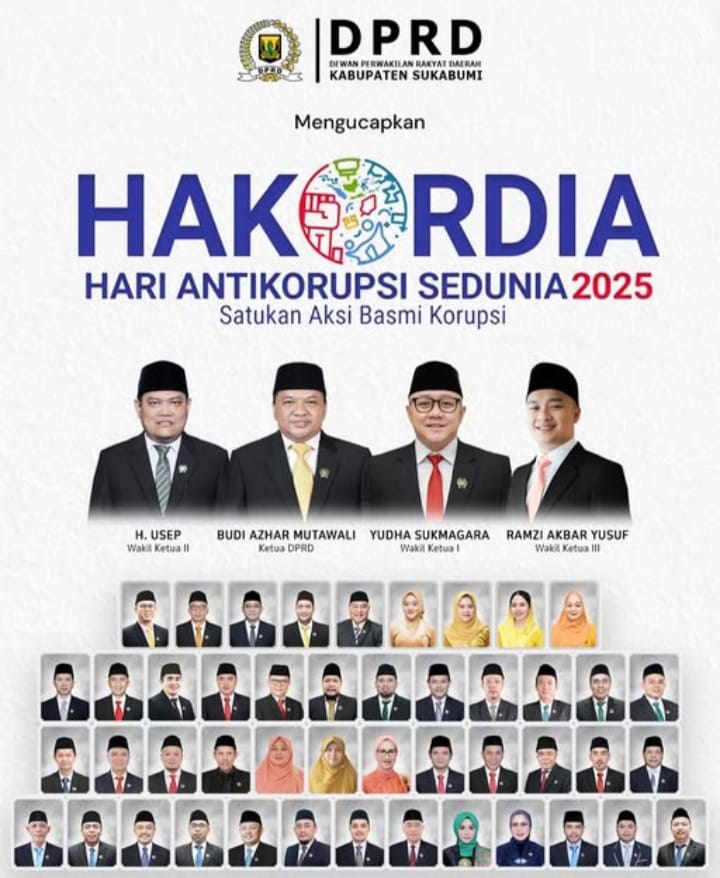 Segenap Pimpinan dan Anggota DPRD Kabupaten Sukabumi mengucapkan Selamat Hari Anti Korupsi Sedunia (HAKORDIA)Dengan tema “𝐒𝐚𝐭𝐮𝐤𝐚𝐧 𝐀𝐤𝐬𝐢 𝐁𝐚𝐬𝐦𝐢 𝐊𝐨𝐫𝐮𝐩𝐬𝐢”, mari kita bergerak bersama, memperkuat kepercayaan publik, serta mewujudkan pemerintahan yang bersih dan berkeadilan.