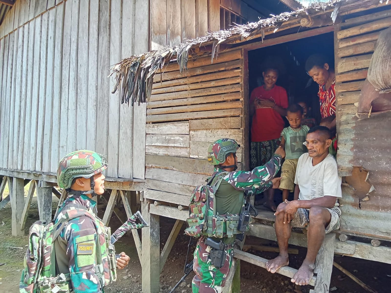 Satgas Pamtas RI-PNG Statis Yonif 753/AVT melalui Pos Sabi melaksanakan kegiatan teritorial dengan melakukan anjangsana dan komunikasi sosial (Komsos) ke rumah masyarakat Kampung Sabi, Distrik Batom, Pegunungan Bintang. (13/12/2025).