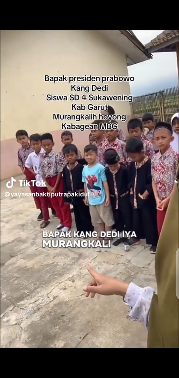 Ponstingan konten di Media Sosial yang di duga di Aploud oleh konten kreator “Teh Lulu” , yang meminta Presiden Prabowo untuk mewujudkan program MBG bagi 45 Siswa siswi di SDN 4 Sukawening , konten Viral tersebut mendapat perhatian dari pihak pihak terkait,