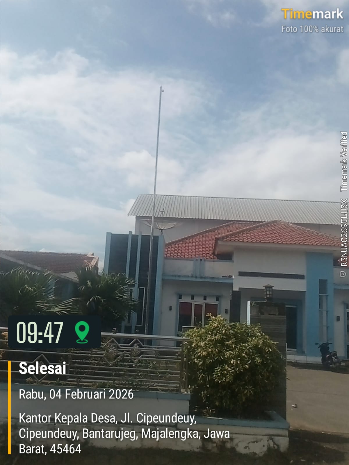 Namun lain halnya denga para perangkat Desa Cipeundeuy Kecamatan Bantarujeg Kabupaten Majalengka, keberadaan kantor Desa Pada Pukul 09.:30.Wib. masih tertutup rapat, namun yang ada satu orang perangkat Desa sedang duduk di warung kopi yang ada di depan kantor Desa, karena lagi nunggu kunci pintu kantor Desa.