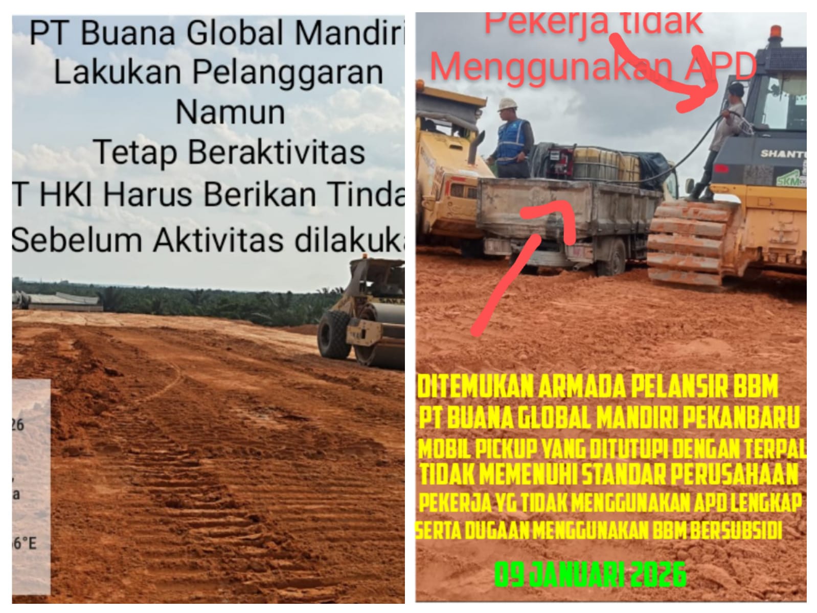 Dan para pekerja PT Buana Global Mandiri yang diduga sengaja tidak menggunakan APD lengkap serta dugaan Penggunaan BBM bersubsidi untuk armada perusahaan.
