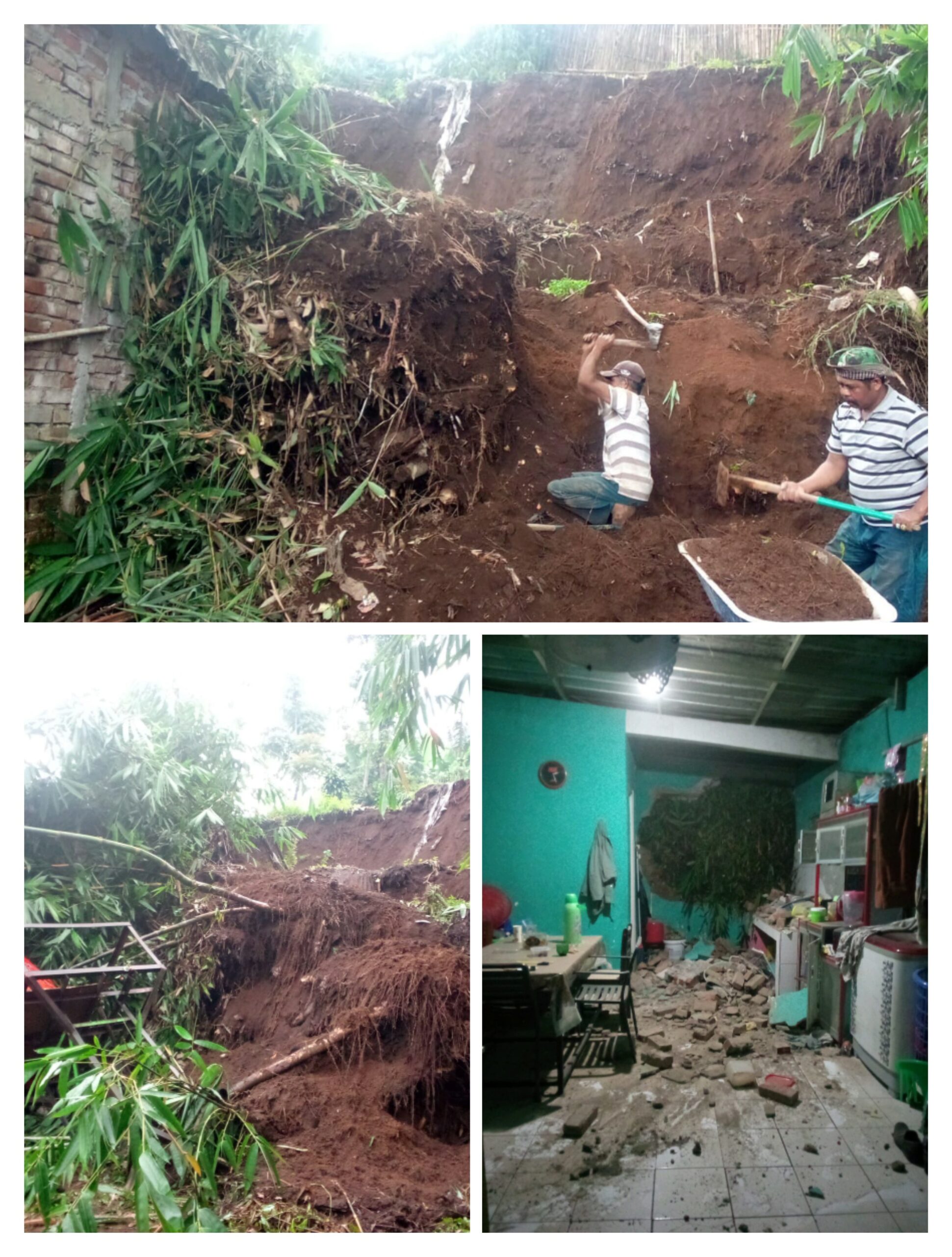 Kejadian tersebut, sontak membuat kami kaget karena ada suara dentuman seperti Ban pecah yang sangat keras mungkin akibat dinding bata dapur jebol, semua yang ada dirumah anak dan istri panik, pas kami lihat ke ruangan dapur tampak bongkahan bata dan tanah berserakan menutupi sebagian ruangan dapur. Sehingga beberapa perabotan rumah rusak parah akibat longsoran tanah tersebut.